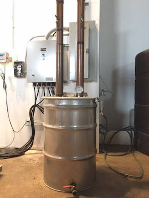 proudly displayed the 250 gallon still which sits adjacent to the smaller,